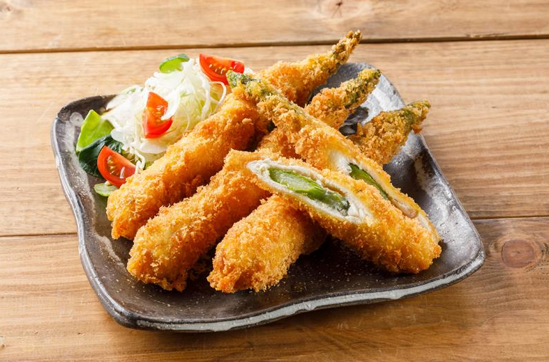 薄くスライスしたむね肉で、旬のアスパラを巻いて揚げたてを提供。