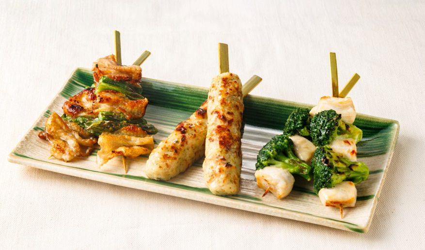 (左から)皮アスパラ串、小エビと青のりのつくね串、むねブロッコリー串